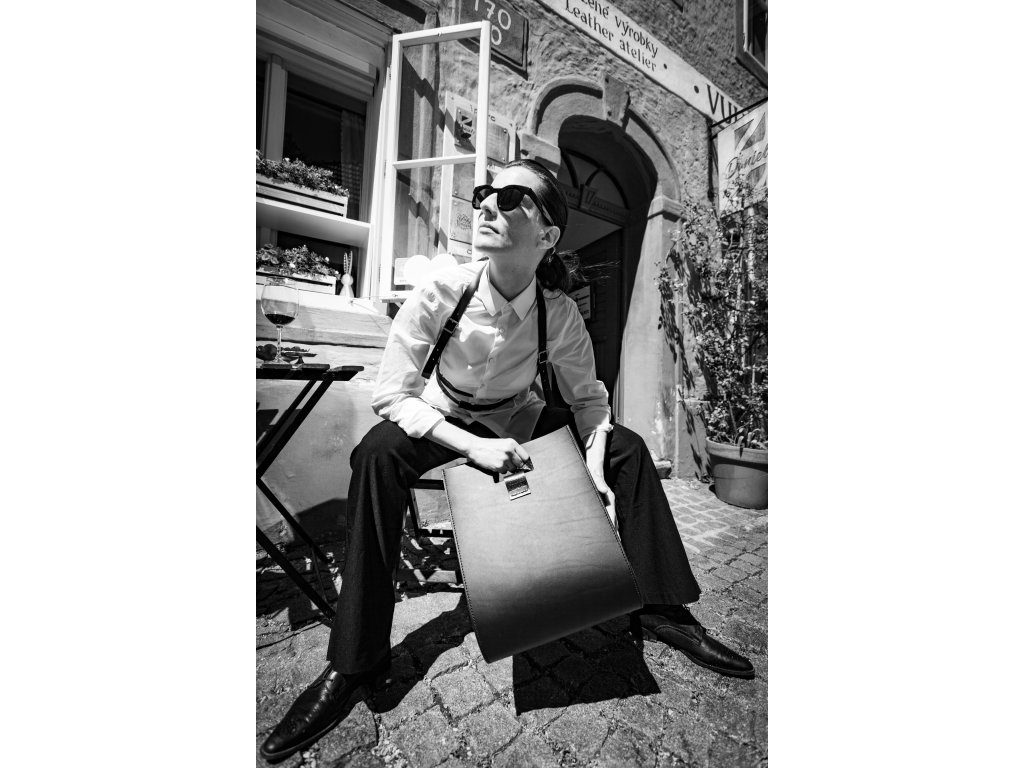 Velká kabelka do ruky z hovězí kůže a jemného semiše působí dokonale elegantně, a to především díky absenci kovových komponentů. Může tak vyniknout kontrast mezi strukturou silné kůže a jemného semiše. Vnitřní kapsička bezpečně uchová mobil či klíče.